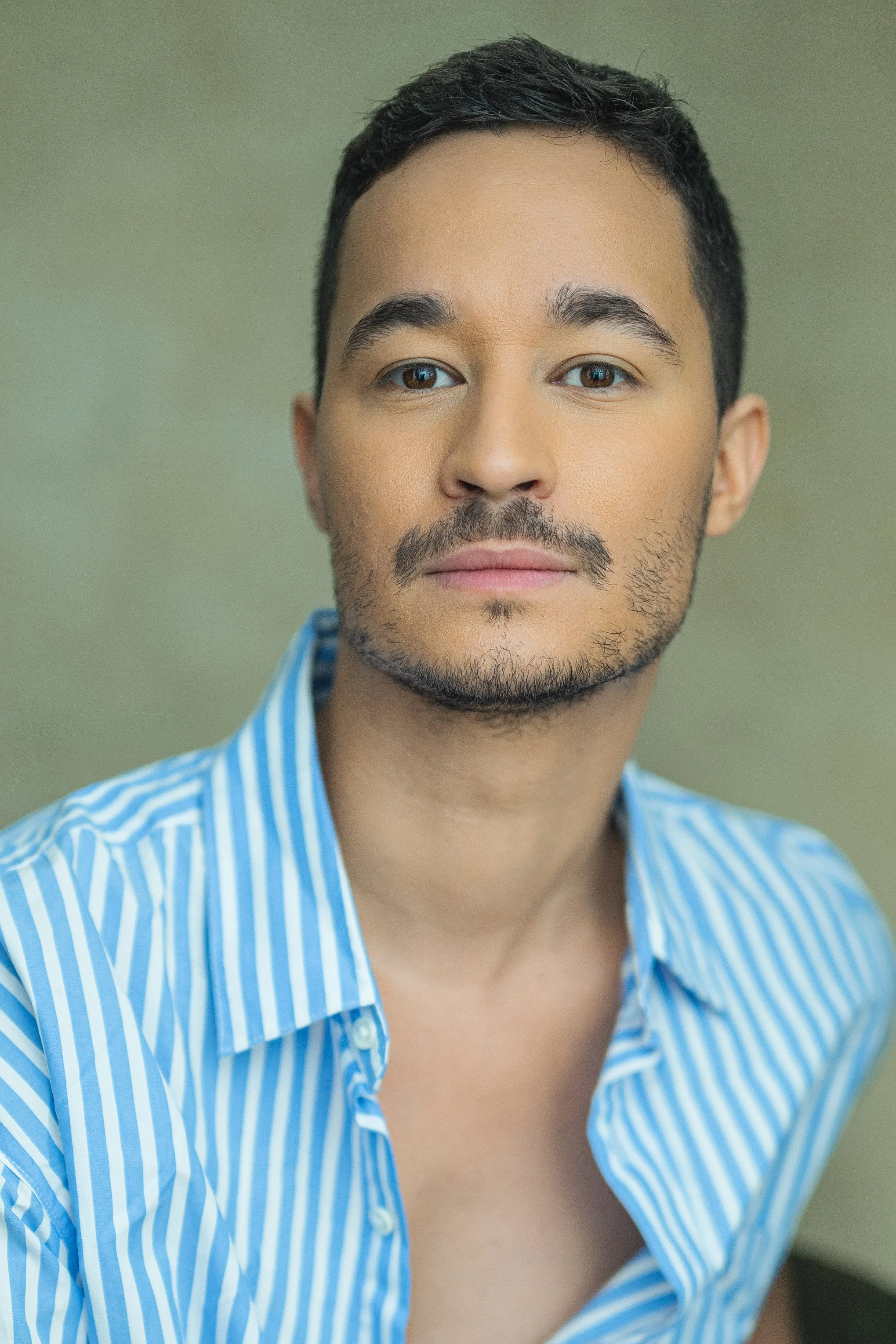 A young man with short dark hair and light skin, looking directly at the camera with a neutral expression. He is wearing a gold velvet jacket with black trim, open at the front revealing his bare chest. The background is blurred with muted colors.
