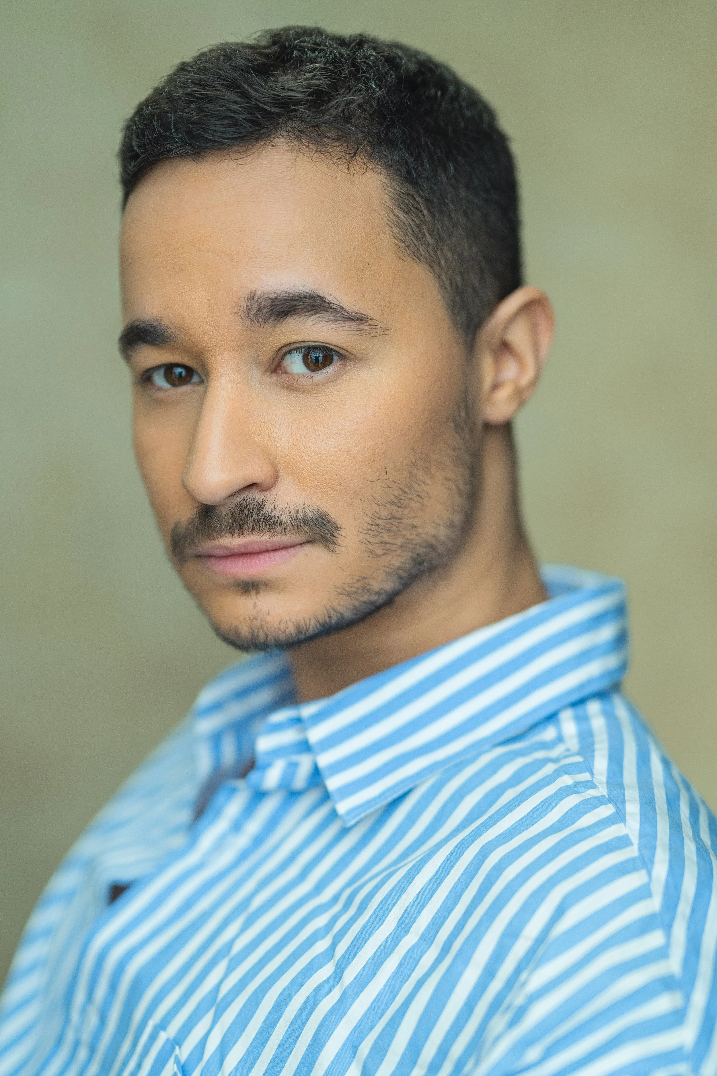 Portrait of a young man with short dark hair, wearing a black chef coat with gold buttons, standing against a dark background.